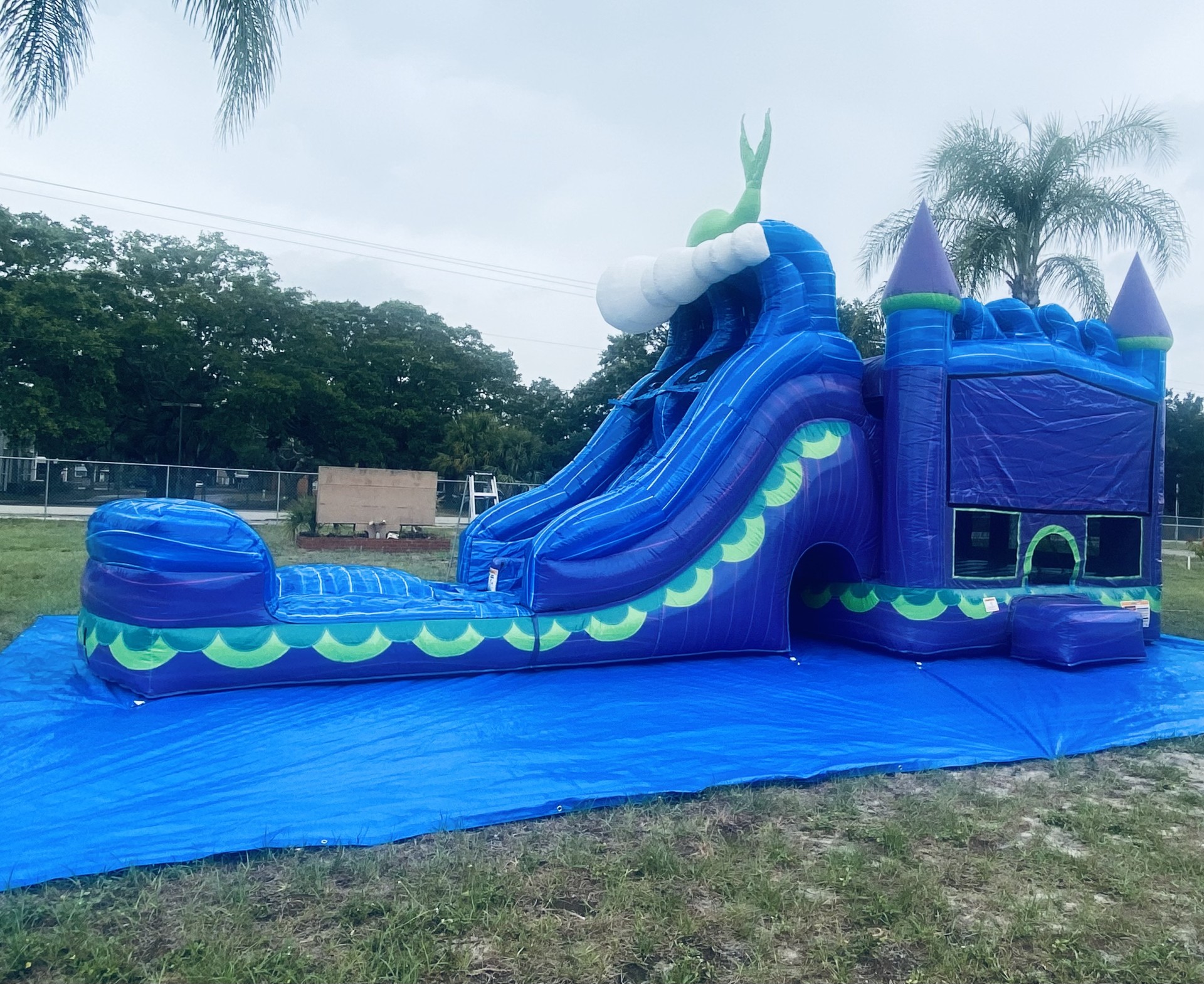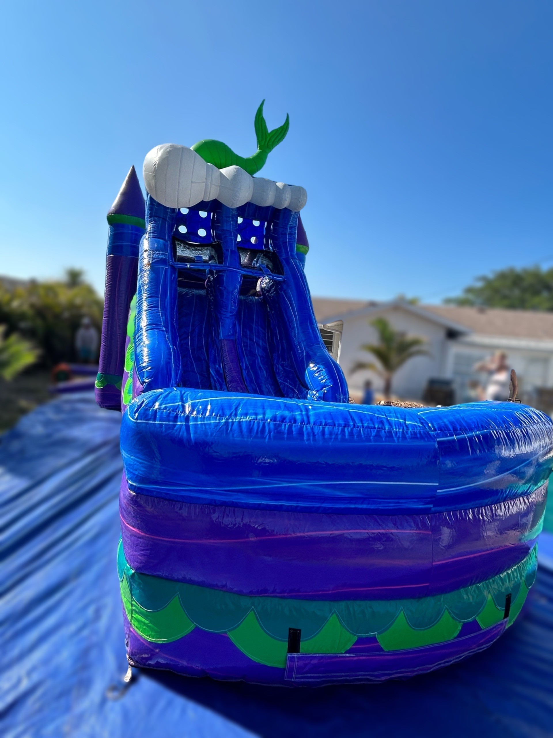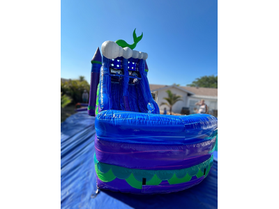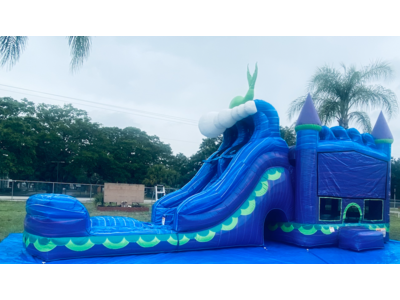 Mermaid Titan Plus (6 In 1) Dual Lane Wet Dry Combo for your party, the “WOW” factor is definitely there. This slide bounce house features 8-foot dual lane slide along with an inflated landing zone for safe use. The splash area has built in drains to keep the water level safe for all ages. Let mermaid and 3D glitter scale shine your party.One easy step to convert this mermaid combo slide into unisex by folding mermaid down into the weave for any occasion. Recommended weight up to 600 lbs. Fun for all ages. Children must be supervised at all times. Full Days Rentals must be picked up before Sundown Overnight Rentals Please select (11:45pm) as last time slot. (NO OVERNIGHTS ON SUNDAYS)