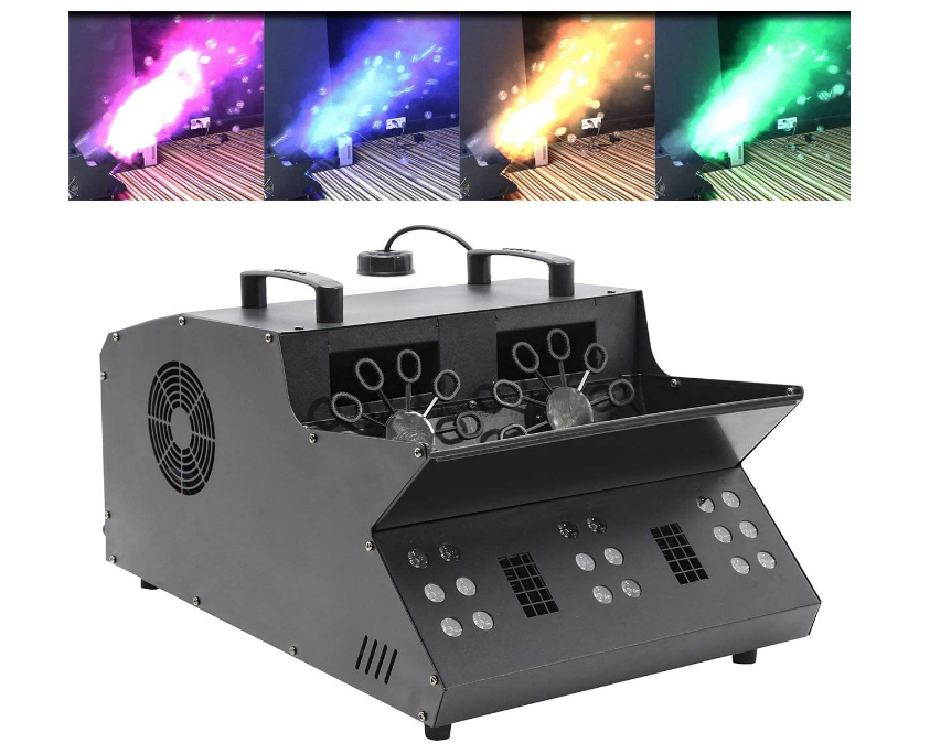 Large Capacity & High Power- 3000W fog - bubble machine with lights has a 1L fog liquid capacity tank. Output distance is up to 12-15ft (No wind conditions). Diversified Control Modes-- Manual, Remote & DMX mode. Not only controlling by menu, but also can use wireless remote. Wireless control distance: up to 10m. The color of LED light can be selected by wireless control or individual fog spray mode. DMX mode has 8 dmx channels, LED light colors, bubble function and fog function can be adjusted separately. Come with Free Fog or Bubble Juice. Recommend for outside use only. Fog can cause the fire alarm detectors to go off if inside . Bubbles can be slippery when contact on hard floors. Please keep away from machine if you have any medical issues. always double check for any of your guest that may have medical issues before renting. Available only with a Bounce House rental.